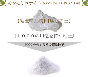 モンモリロナイトは《1000の用途を持つ粘土》と賞されるほど応用範囲が広く、その特性はスキンケアにすばらしい効果が発揮されています。 |